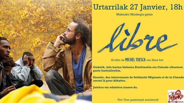 Makeako TXIR-TXOR gaztetxeak antolatzen duen neguko zinemaldiak segitzen du. Heldu den igandean "Libre" filma ikusten ahalko da (18:00), Mindegia gela berotuan. "Libre" Michel Toescak, 2018an, egin duen dokumentala da. Frantziako, Roya ibarrean, Cédric Herrouk migranteen harrera eta babesa antolatzeko eraman duen borroka aipatzen du. Cédric Herrou, Euskal Herrira hurbildu zen joan den urrian, film hunen aurkezteko, leku desberdinetan arrakasta ukan zuen. Ondotik izanen da debatea Etorkinekin eta Cimade elkarteetako kideek animaturik. Gaualdia bururatzeko, jatekoa eta edatekoa proposatuak izanen zaizkizue.