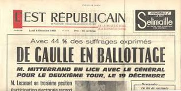 Bi hilabeteren buruan, bozkatzera deituak izanen gira presidente bozentzat. Bi hilabete horietan, presidente bozketako historia kondatuko dauzuet, 1965ean hasiz, urte horretan, lehen aldikotz, frantses herritarrek Errepublikako presidentea zuzenki hautatu baitzuten. De Gaulle-ren borondatea izan zen. Presidente bilakatu zen 7 urte lehenago, 1958ko abenduan, baina hautetsiek zuten hautatu eta ez populuak zuzenki.