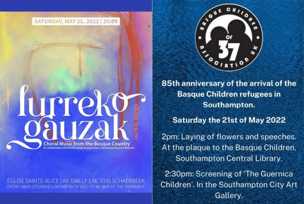 SOUTHAMPTON, INGALATERRA. Aurten 85 urte dira Gernikako Bonbardaketa gertatu zela, eta beste hainbeste 4.000 euskal haur Ingalaterrara ebakuatu zituztela gerlaren karietara. Hori oroituko dute maiatzaren 21ean, zenbait ekitaldi eginik, batetik Southampton-en, lore-sorta bat ezarririk, hitzaldiekin eta 'The Guernica Children' filma emanik hiriko liburutegian eta Arte Galerian. Baita Bizkaiko Santurtzin ere, ekitaldi batekin. Eta Zoom bidez, Chinoko Begoña Echeverriaren, eta Annika Speer-en 'Picasso Presents Gernika' filmarekin. Non ikusi: https://ucr.zoom.us/j/99855013109 eta ID: 998 5501 3109. On egin!