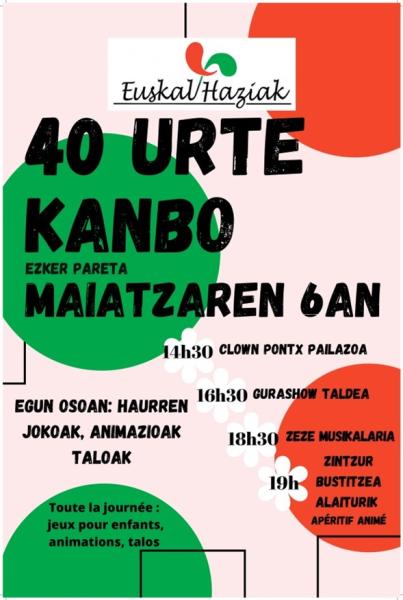 Euskal Haziak elkarteak 40 urteak ospatzeko asmoz, besta herrikoia programatu nahi ukan du: Haziak Bestan, Kanboko ezker paretan, maiatzaren 6an! Besta herrikoia, denei zuzendua: familiei, haurrei, nerabeei, gurasoei, irakasleei!