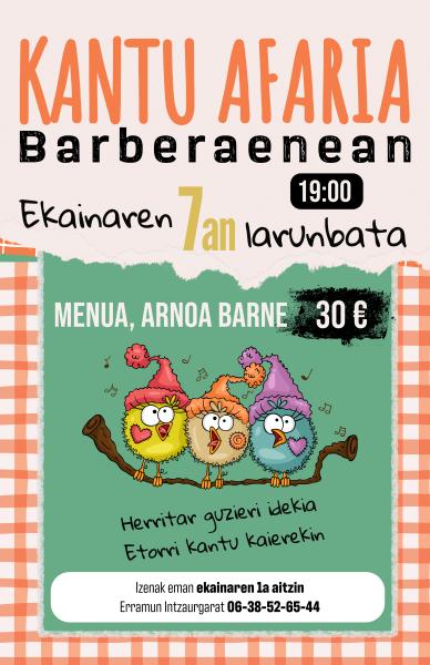 Jadanik aipatu bezala, Otxaldetarrak elkarteak antolatzen duen kantu afaria ekainaren 7an iraganen da Barberaenean, larunbatez (19:00etatik goiti). Izenak eman behar dira ekainaren 1eko berantenaz, Erramun Intzaurgarati: 06-38-52-65-44.