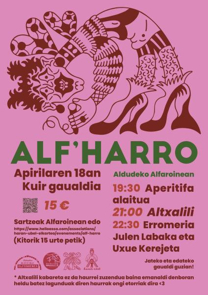 Apirilaren 18an, Alfaroinean, “Alf’Harro” izeneko kuir gaualdia iraganen da. Gaualdia aperitifa alaitu batekin hasiko da (19:30). Ondotik (21:00), Altxalili kabareta izanen da, eta (22:30) erromeria Julen Labaka eta Uxue Kerejetarekin, dantzarako eta besta luzatzeko parada eskainiz. Sartzea 15€-tan izanen da, eta hobe txartelak aitzinetik Alfaroinean edo Internet bidez, helloasso.com-en hartzea. Gaualdi osoan jateko eta edateko izanen da. Antolatzaileek azpimarratzen dute Altxalili kabareta ez dela haurreri zuzendua, bainan emanaldi denboran, heldu batez lagundurik, heldu diren haurrak ongietorriak izanen direla.